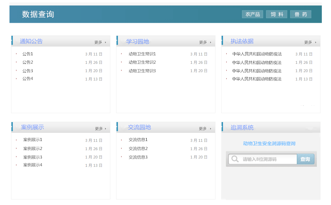 “数据查询”包含了海量的动物卫生数据,其中涉及:饲料、兽药、农产品等各个种类的数据,帮助经营户有效采购合法产品、以及帮助动监执法人员有效的辨别产品的合法性。