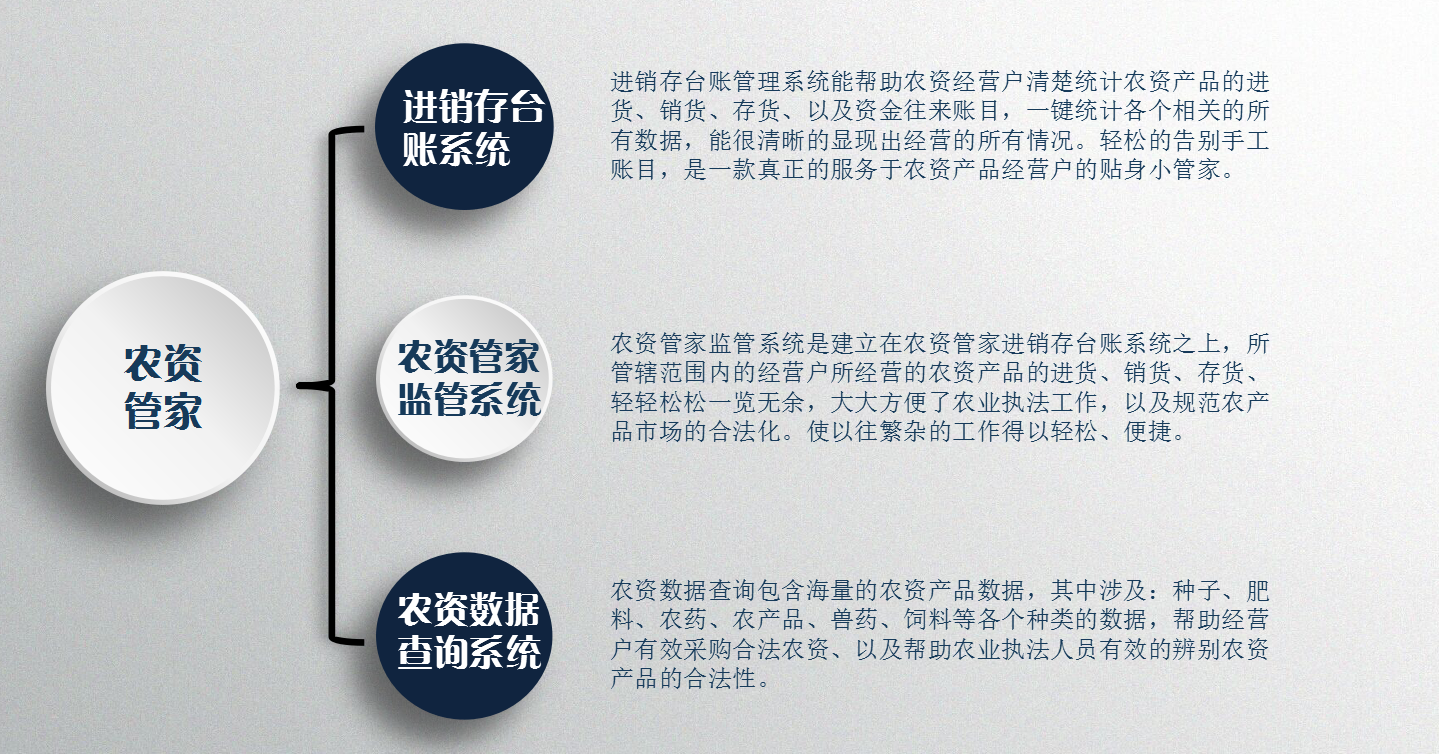 农资管家监管平台提供给省农业厅、市局、县局主管部门领导使用,启用这个功能之后,只需要把下属经营户的进销存添加到此平台,局执法人员就可以通过平台数据,掌握经营户店里的销售与经营状况、 农资产品流向,可以清楚的了解每个经营户经营的产品种类,以及其进货来源与销货去向,给执法工作带来很大的便利。