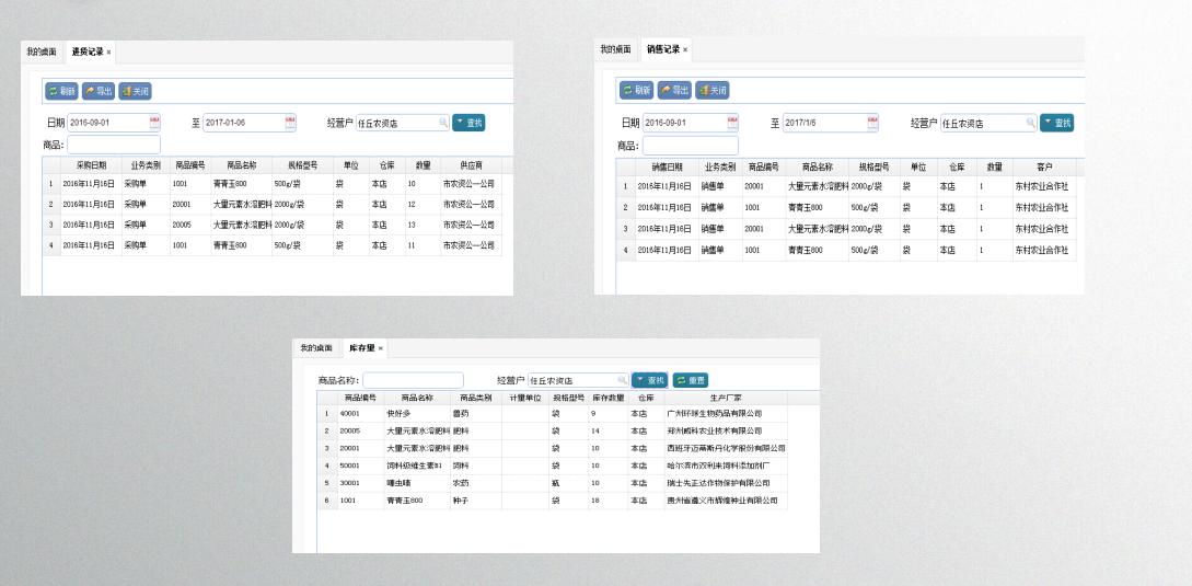 进销存台账管理系统能帮助农资经营户清楚统计农资产品的进货、销货、存货、以及资金往来账目,一键统计各个相关的所有数据,能很清晰的显现出经营的所有情况。轻松的告别手工账目,是一款真正的服务于农资产品经营户的贴身小管家。